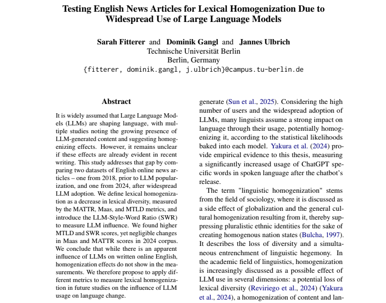 At the ACL 2025 Student Research Workshop (28–29 July, 63rd Annual Meeting of the Association for Computational Linguistics), Sarah Fitterer, Dominik Gangl, and Jannes Ulbrich (TU Berlin) presented their paper Testing English News Articles for Lexical Homogenization Due to Widespread Use of Large Language Models.