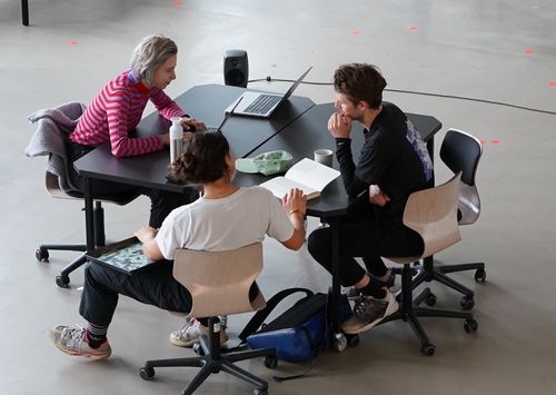 With the help of the TUB carpenters, we upcycled 30 "old" desks that we found in a furniture store at the university. They were fitted with castors and new black tops, designed to make the corners more resistant to knocks. These modifications not only gave the desks a new functionality for mobile use, but also improved their appearance aesthetically.